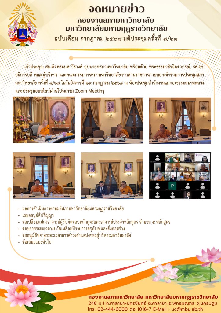 เจ้าประคุณ สมเด็จพระมหาวีรวงศ์ อุปนายกสภามหาวิทยาลัย พร้อมด้วย พระธรรมวชิรจินดาภรณ์, รศ.ดร. อธิการบดี คณะผู้บริหาร และคณะกรรมการสภามหาวิทยาลัยจากส่วนราชการภายนอก เข้าร่วมการประชุมสภามหาวิทยาลัย ครั้งที่ ๗/๖๘ ในวันอังคารที่ ๒๙ กรกฎาคม ๒๕๖๘ ณ ห้องประชุมสำนักงานแม่กองธรรมสนามหลวงและประชุมผ่านโปรแกรม Zoom Meeting